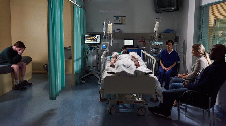 As a nurse explains to the couple that the situation is terminal, the focus of the advertisement switches to the man who’s decision to throw a punch has effectively ended a life.